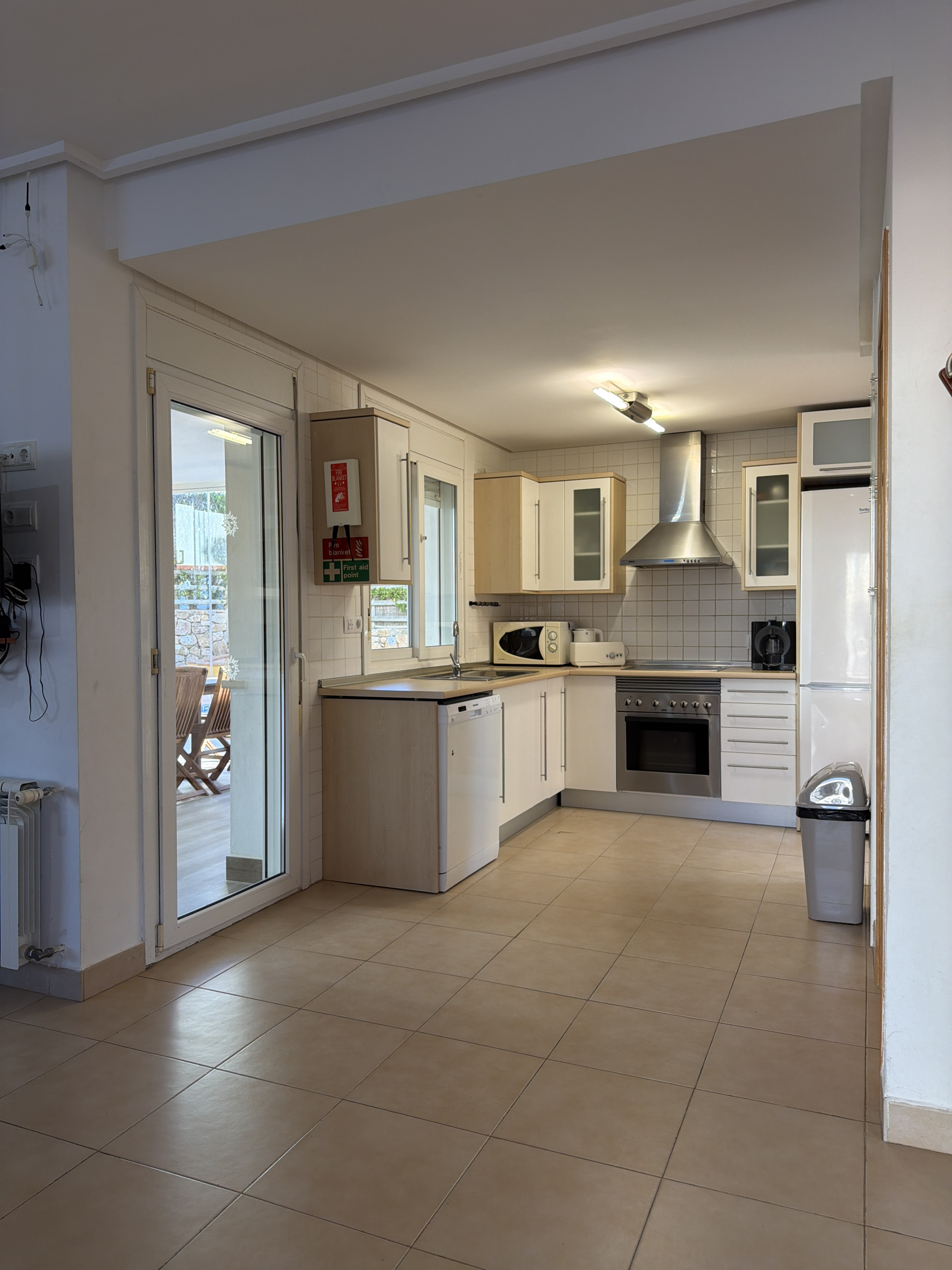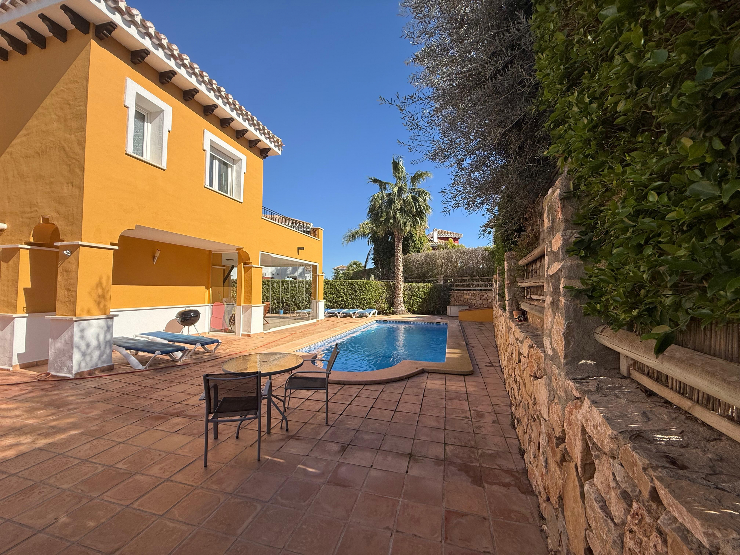 Designed for both comfort and elegance, the property boasts a bright and spacious open-plan living and dining area, seamlessly connected to a modern fully fitted kitchen — ideal for entertaining and relaxed Mediterranean living. Large sliding doors with glass curtains create a versatile indoor–outdoor space, allowing you to enjoy the sunshine year-round while overlooking the garden and pool.